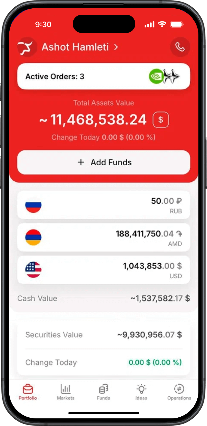 - Профиль пользователя с персональными данными, контактами брокера, поддержкой (звонок, e-mail), настройками (подтверждение операций)